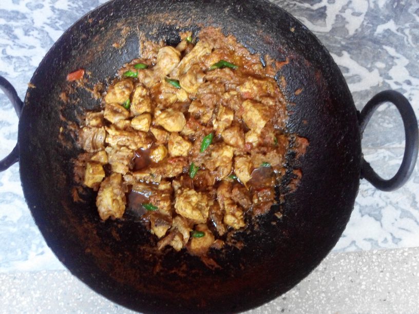 - Wash the chicken and cut in small pieces; put a Wok (Karahi) on the high flame (use a wok made of iron – This is IMPORTANT);