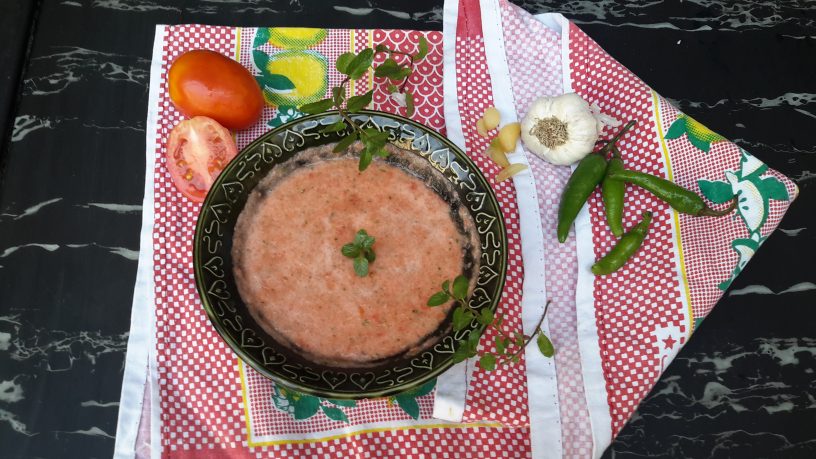 Put the tomatoes, mint leaves and green chilies and garlic in a blender, add ¼ cup of water and blend it well.