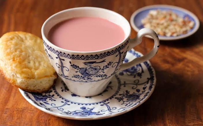 Pink tea or Kashmiri chai is a usually served in winter. Kashmiri people are very fond of this tea as it is caffeine free and keeps one hot in the winter. Usually it is garnished with chopped almonds and pistachio. In winter it is served in hotels and street vendors also serve it.