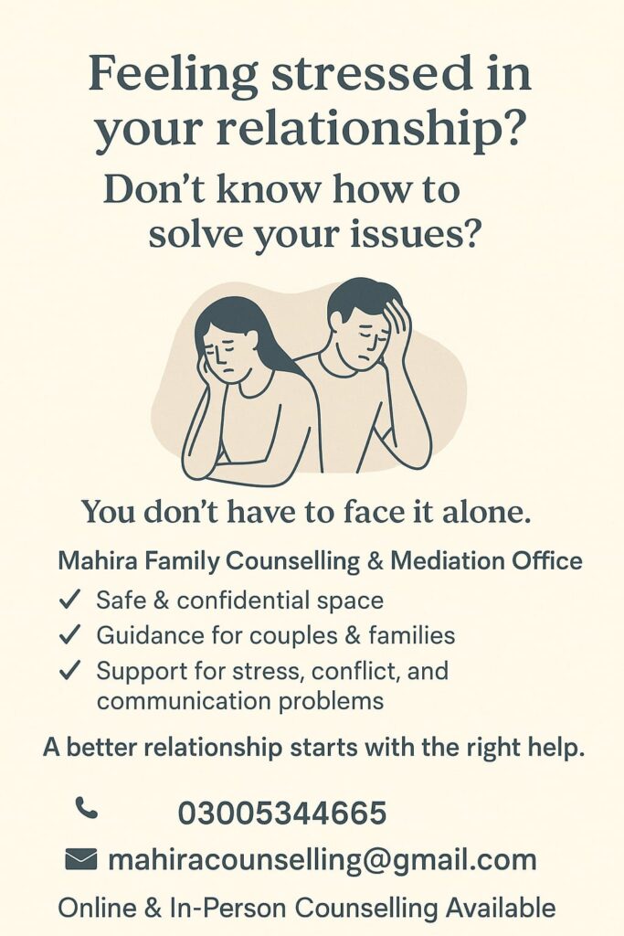 Mahira Family Counselling and Mediation was founded by Mahira Khalid, a counselling psychologist and family mediator. She specializes in couples therapy and focuses on helping people build healthier, stronger relationships.