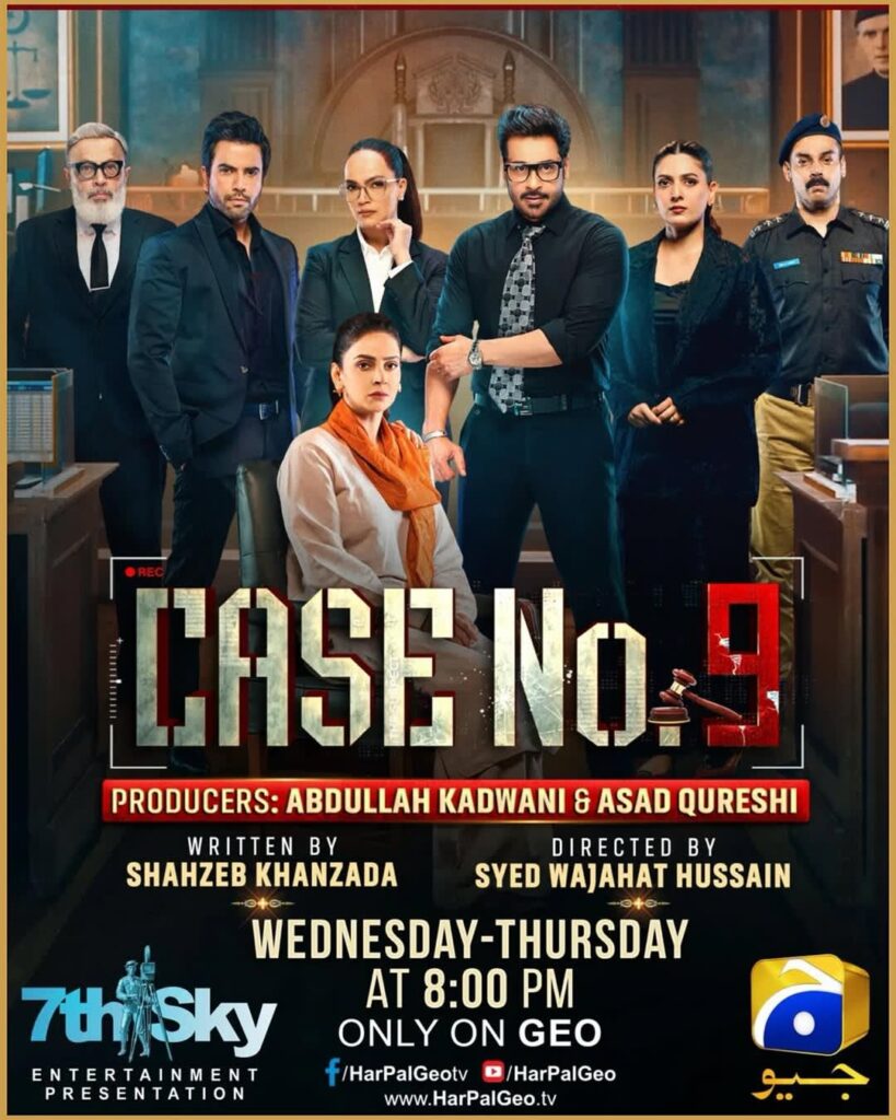 Case No. 9 is a Pakistani television drama aired on Geo Entertainment and produced by Abdullah Kadwani and Asad Qureshi under the banner of 7th Sky Entertainment. The drama is written by Shahzeb Khanzada and directed by Syed Wajahat Hussain. It features a powerful ensemble cast led by Saba Qamar in the central role of Sehar Moazzam, alongside Faysal Quraishi, Junaid Khan, Aamina Sheikh, and Naveen Waqar. The supporting cast includes seasoned and respected actors such as Hina Bayat, Rushna Khan, Azra Mohyeddin, Gohar Rasheed, Ali Rehman Khan, Mizna Waqas, Noor ul Hassan, Kamran Jilani, Faiza Gillani, and others, adding depth and realism to the narrative. The drama addresses complex social and legal issues, particularly sexual violence, justice, and institutional power, and is noted for its serious tone, strong performances, and willingness to engage with uncomfortable but necessary themes in contemporary Pakistani society.
